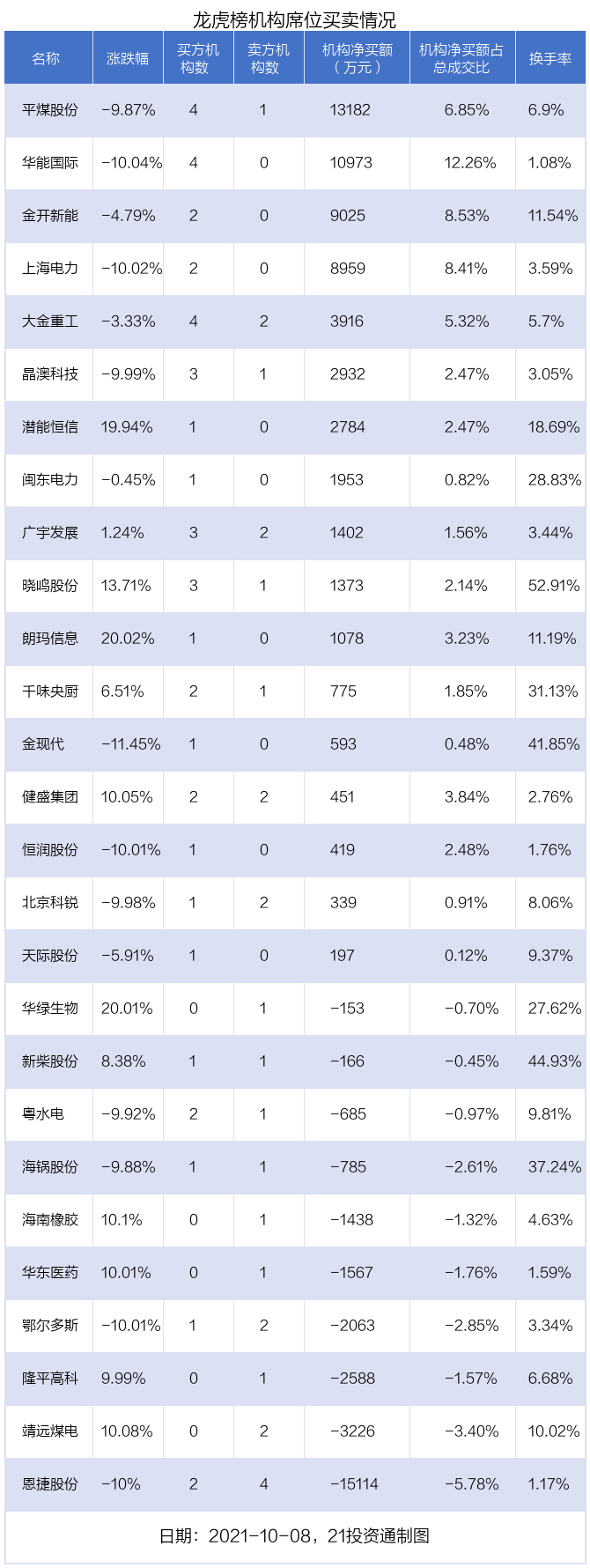其中,机构净买入金额最多的是平煤股份(601666.SH),当日收盘下跌9.87%,换手率为6.9%。前五大买卖营业部中有0家机构,为合计净买入0万元,占总成交金额的0%。