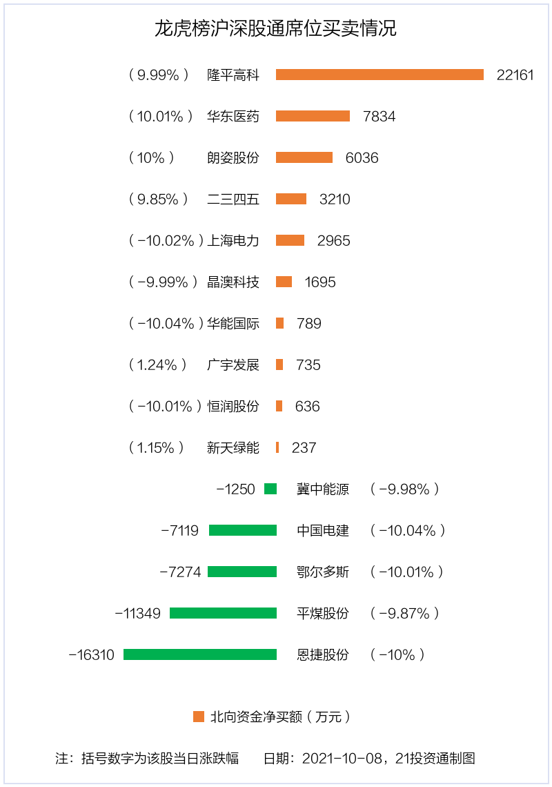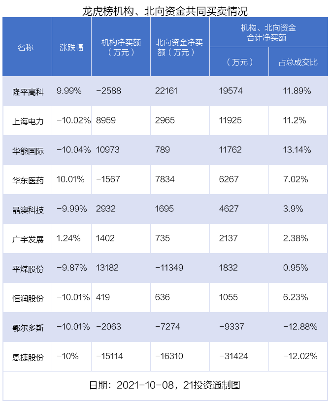 值得注意的是,机构和北向资金共同净买入了上海电力、晶澳科技、华能国际、广宇发展、恒润股份等5股;共同净卖出了鄂尔多斯、恩捷股份等2股;在隆平高科、华东医药、平煤股份上出现分歧,机构净卖出隆平高科2587.52万元,北向资金净买入2.22亿元;机构净卖出华东医药1567.2万元,北向资金净买入7834.1万元;机构净买入平煤股份1.32亿元,北向资金净卖出1.13亿元。