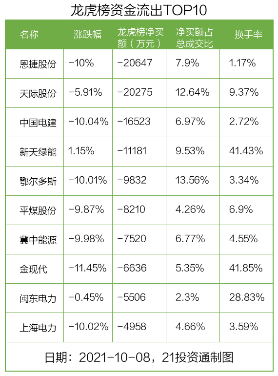 而龙虎榜中资金净流出最多的是恩捷股份(002812.SZ),被净卖出为2.06亿元,占总成交金额的7.9%。恩捷股份收盘下跌10%,换手率为1.17%。