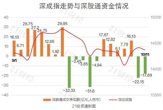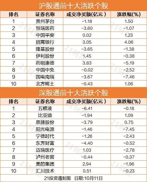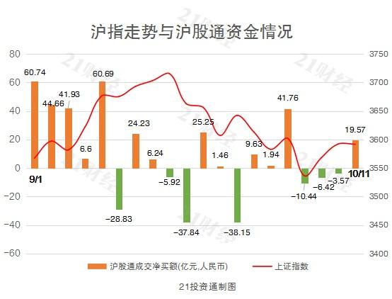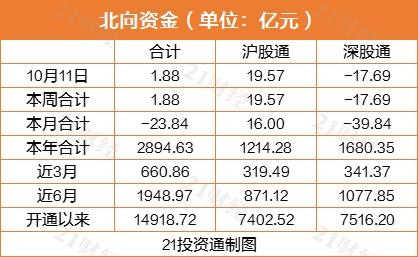 据21投资通(微信号ID:touzit21)智能监测,10月11日,北向资金全天合计净买入1.88亿元。具体来看,沪股通净买入19.57亿元,深股通净流出17.69亿元2。