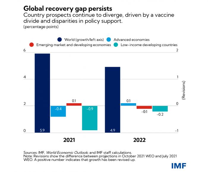 新冠变异病毒在全球一些区域继续蔓延,全球供应链遭受冲击,通货膨胀在多国抬头……在多重不确定因素叠加之下,全球经济前景被笼上了阴云。10月12日,国际货币基金组织(IMF)在最新一期《世界经济展望》中将2021年全球经济增速比三个月前下调0.1个百分点至5.9%,维持对2022年4.9%的预测。
