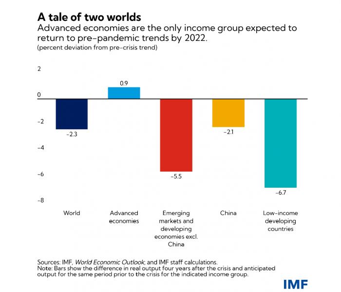 戈皮纳特指出,各国经济前景的分化仍然是一个主要问题。发达经济体的总产出预计将在2022年恢复至大流行前的趋势,并在2024年比该趋势高出0.9%。相比之下,新兴市场和发展中经济体(不包括中国)的总产出预计在2024年仍将比大流行前的趋势低5.5%。