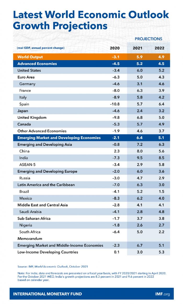在新兴市场和发展中经济体中,IMF维持了对印度今年9.5%的经济增速预测,但将东盟五国的增速大幅下修1.4个百分点至2.9%。得益于大宗商品价格上涨,俄罗斯被上调0.3个百分点至4.7%,沙特被上调0.4个百分点至2.8%,南非被上调1.0个百分点至5.0%。