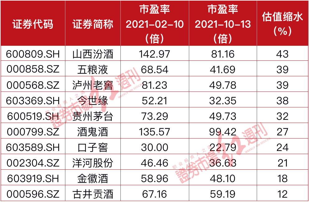 从个股来看,目前,茅台、泸州老窖、五粮液等估值水平多在30~40倍,相较于年初普遍缩水3~4成。以茅台为例,最新估值49倍,相较于春节前最后一个交易日(73倍)下降32%,山西汾酒估值下降最高为43%。(见附表)。
