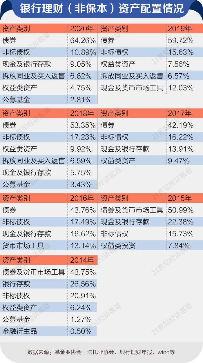 解读:“由于资管新规后银行多配标品、压缩非标,近年来银行理财中债券配置比例明显提高,2020年这项占比为64.26%,为近7年来最高。在理财子公司开业之后,为了符合新规“代客理财、盈亏自负”的要求,且适应普通客户对稳定收益一贯的追求,银行更倾向于设计“固收+”系列产品,债券打底,加权益类资产或衍生品,因此债券在资产配置的占比有所提高。另外,随着债权投资风险点出现,理财产品在2020年的风险偏好上升,AA+及以上的高评级债券规模为11.48万亿元,占信用债总持仓规模83.36%,同比上升2.15个百分点。