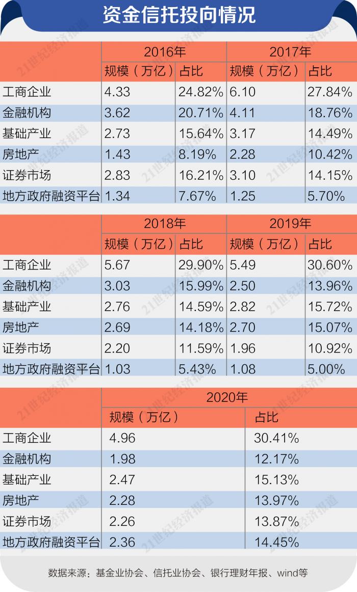 解读:从资金投向来看,为响应服务实体经济的号召,在总规模缩减的情况下,信托投向工商企业的资金占比不断提升,2019-2020年持续维持在三成以上;近两年基础产业信托规模超越金融机构和证券市场成为资金信托投向的第二大领域,分别为15.72%和15.13%,高于金融机构13.96%和12.17%,也高于证券市场10.92%和13.87%;在“房住不炒”、房地产“三条红线”(房企剔除预收款后的资产负债率不得大于70%、净负债率不得大于100%、现金短债比不小于1”)的监管约束下,2020年末,房地产资金信托余额为2.28万亿元,同比2019年末2.70万亿元下降15.75%,环比三季度末2.38万亿元下降4.19%,2020年末占比为13.97%,低于2019年末的15.07%。