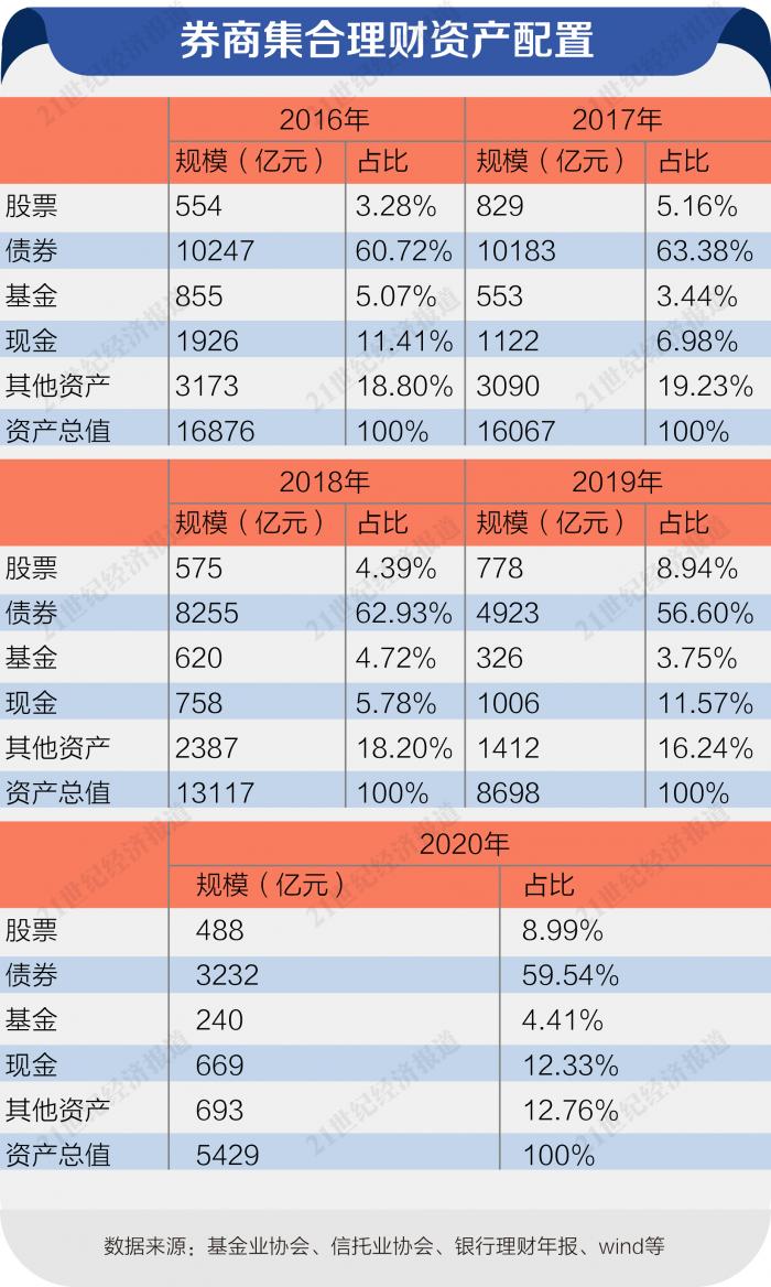 可以看出,券商集合理财资产投向中股票略微提升,规模占比从2018年的4.39%提升到2020年的接近9%,债券投资占比也从上一年的56.6%上升到59.54%。