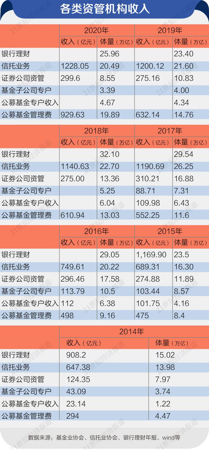 解读:受制于资管新规而业务增长停滞,大部分以通道为主的资管业务收入有大幅下降,而以主动管理能力见长的资管机构受到影响较少。去年信托行业虽然体量下降1.11万亿元,但收入基本维持2019年水平。而遇上2020年的牛市行情,公募基金管理费更是有了大幅提升,增幅为47%。