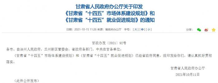 10月17日,甘肃省人民政府办公厅印发《甘肃省“十四五”市场体系建设规划》和《甘肃省“十四五”就业促进规划》。