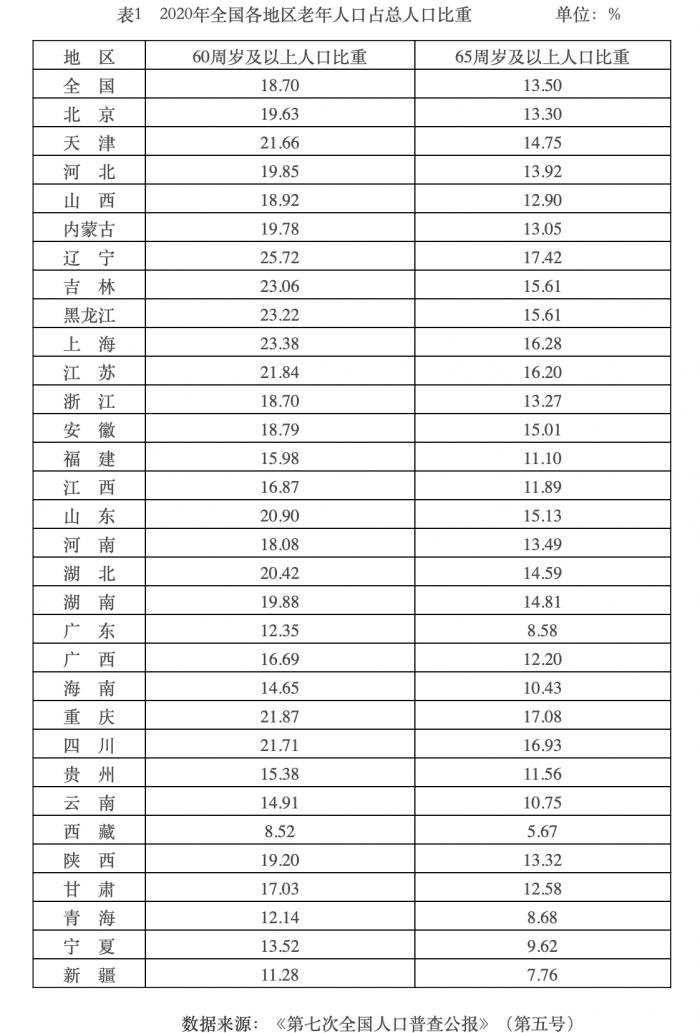 (图片:2020年全国各地区老年人口占总人口比重 数据来源:《第七次全国人口普查公报第五号》)
