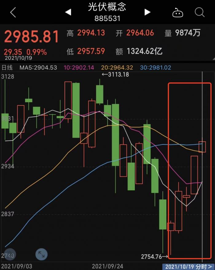 国庆节后,排产消息陆续放出,政策端持续利好,博弈担忧有所解除,基本面强势支撑下,板块反弹,连续五个交易日持续上涨,截至10月19日收盘,光伏板块再次上涨0.99%,跑赢大盘。