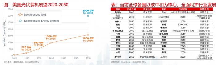 海外:欧美持续加码,全球共迎碳中和。此前,美国能源部发布太阳能前景研究报告,预计2035年累计光伏电站760-1000GW,光伏发电占比40%左右;2050年累计光伏电站1050-1570GW,光伏发电占比45%左右。据此计算,2021-2025年年均装机规模需超30GW,2025-2030年需超60GW,相比2016-2020年年均装机的13.6GW,显著增长,支持同样明确。