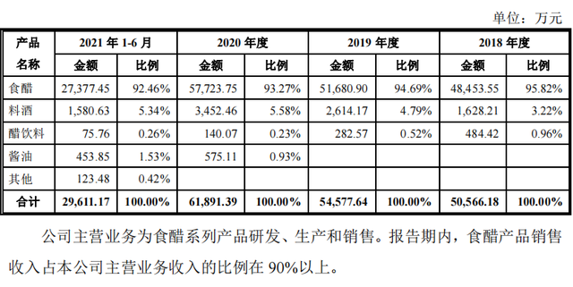 招股书显示,2018年至2020年,食醋系列产品占紫林公司营收的比重均为90%以上,是公司最主要的营收和利润来源。