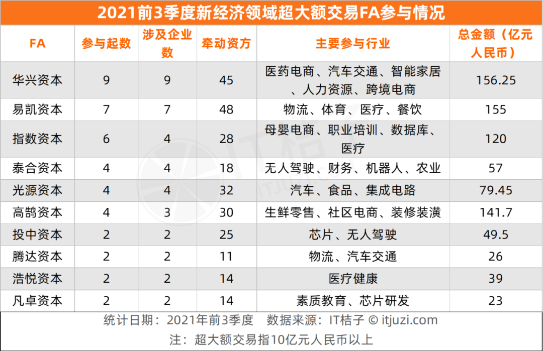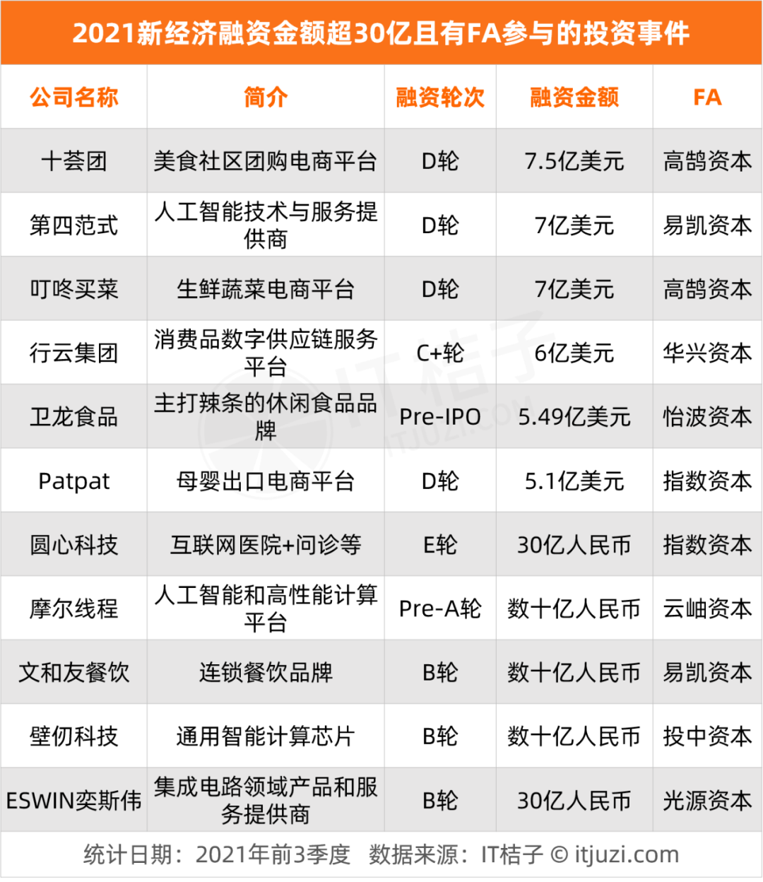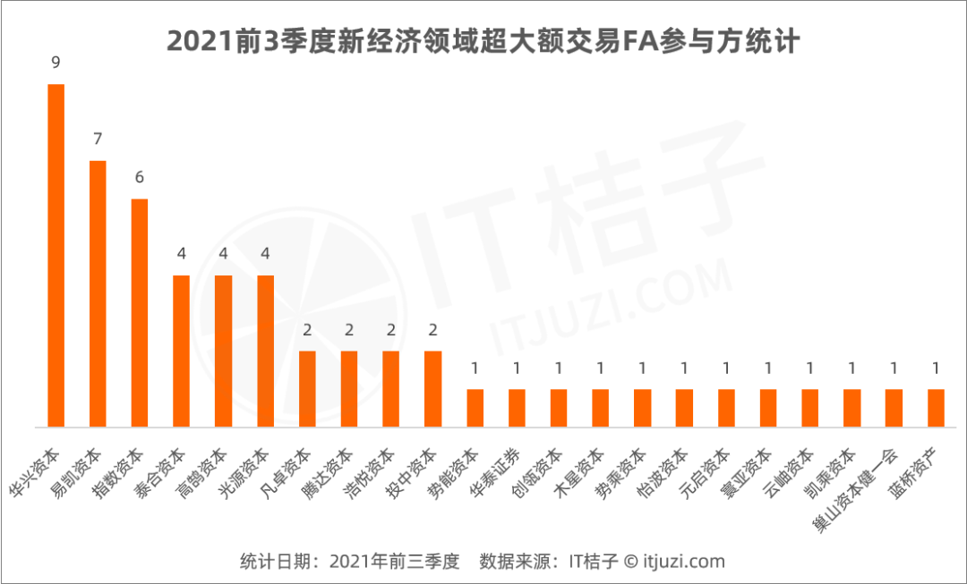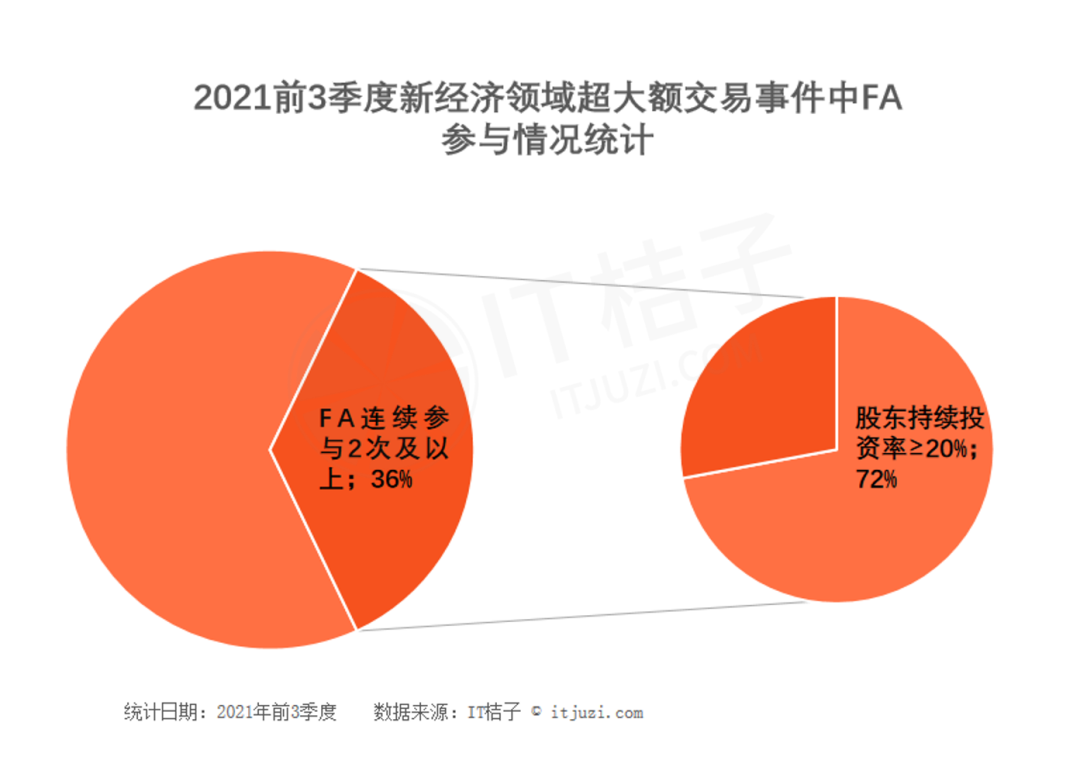 每一起 10 亿元级别的交易中,站在背后赚取交易佣金的 FA 们总是低调的耀眼。据 IT 桔子数据显示,2021 年前三季度新经济领域发生的投资交易中,单笔融资金额超过 10 亿元且有 FA 参与撮合的投资事件有 54 起,相关总投资额突破千亿。