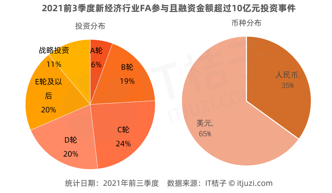 总体来看,2021 年前 3 季度,单笔金额在 10 亿元人民币以上且有 FA 参与的 54 起投资事件,主要集中在已具有规模效应的成熟企业或新兴技术类企业,整体偏向后期。