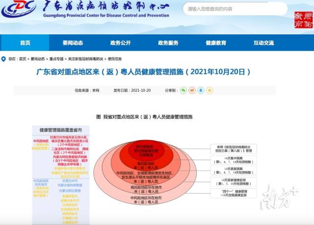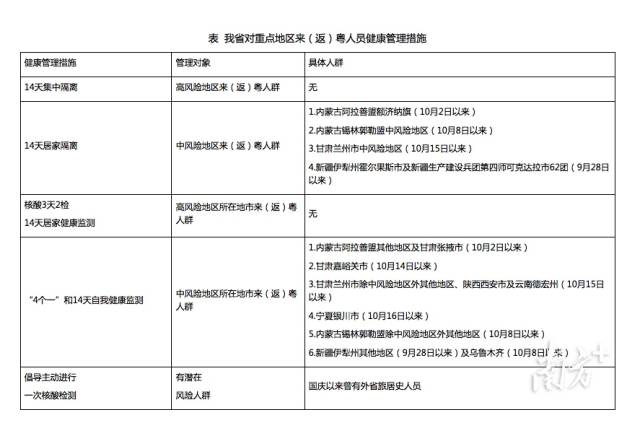 10月20日,广东省疾病预防控制中心官网更新对重点地区来(返)粤人员健康管理措施。截至10月20日,具体措施及对应人群情况如下: