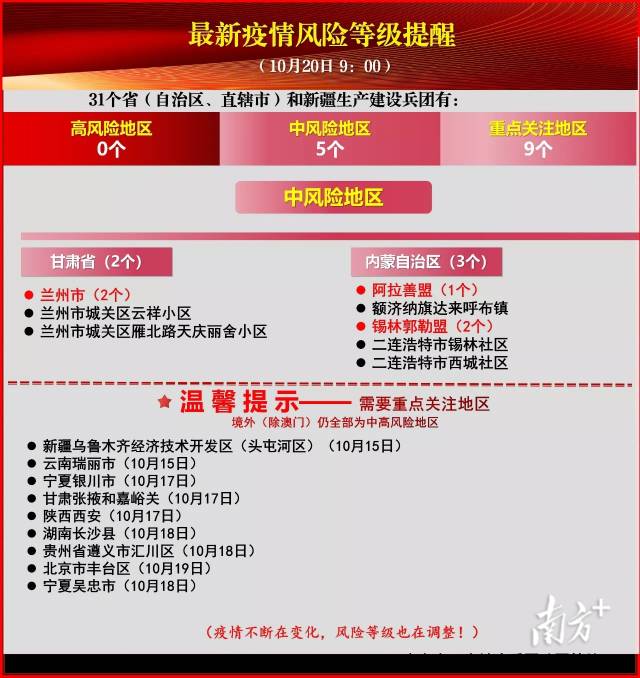 根据广东省卫生健康委发布的最新疫情风险等级提醒,截至10月20日9时,全国共有中风险地区5个,重点关注地区9个。
