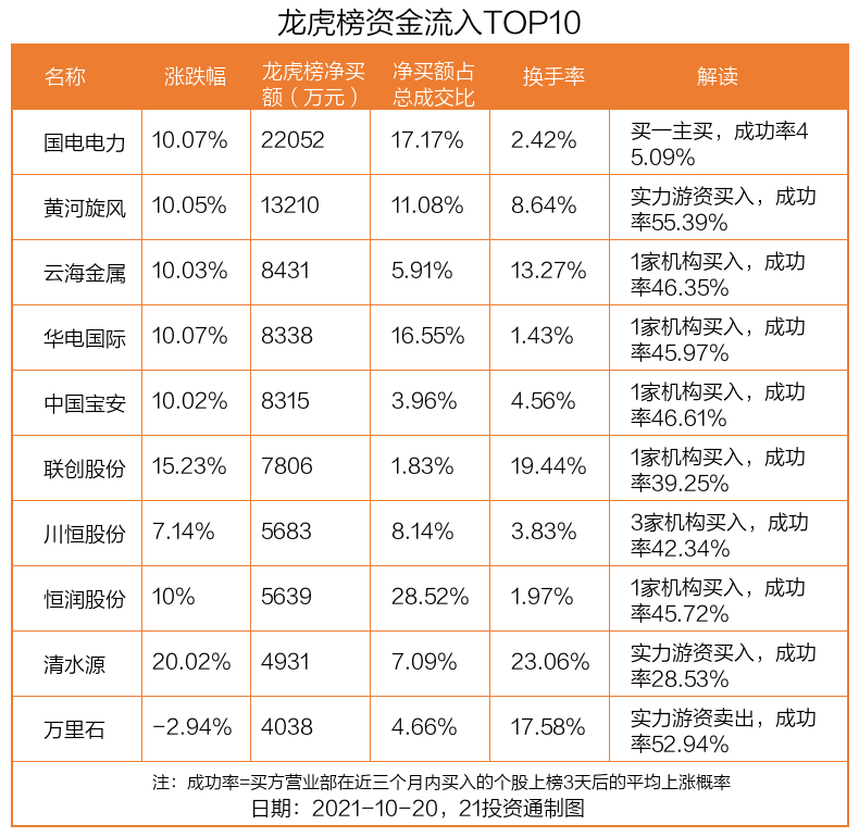 10月20日,上证指数下跌0.17%,深证成指下跌0.33%,创业板指下跌0.37%。盘后龙虎榜数据显示,共有47只个股因当日异动登上龙虎榜,资金净流入最多的是国电电力(600795.SH),达2.21亿元。