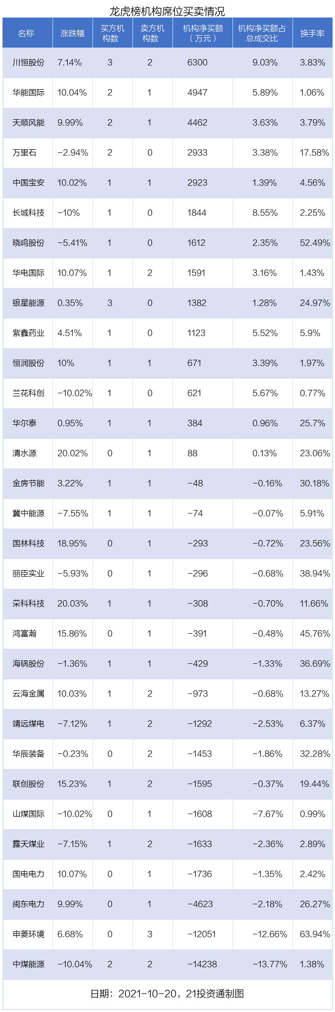 据21投资通(微信号ID:touzit21)智能监测,31只个股龙虎榜出现了机构的身影,北向资金参与龙虎榜中的个股共涉及10只。