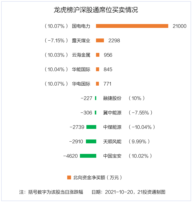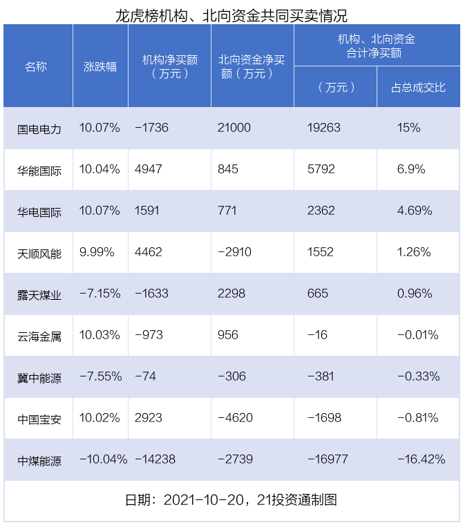 值得注意的是,机构和北向资金共同净买入了华能国际、华电国际等2股;共同净卖出了冀中能源、中煤能源等2股;在国电电力,露天煤业,云海金属,天顺风能,中国宝安上出现分歧。