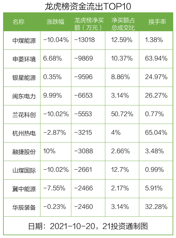 而龙虎榜中资金净流出最多的是中煤能源(601898.SH),被净卖出为1.3亿元,占总成交金额的12.59%。中煤能源收盘下跌10.04%,换手率为1.38%。