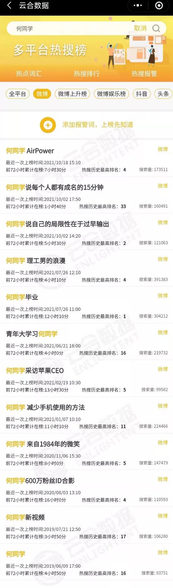 “何同学”相关热搜(数据来源:云合数据)