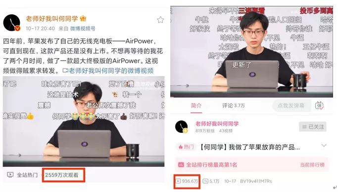 “何同学”发布的视频内容。左为微博,右为B站