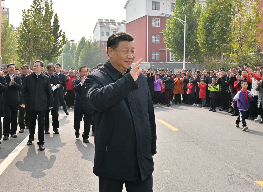 ↑这是座谈会前,习近平21日上午在东营市垦利区董集镇杨庙社区考察时,向社区干部群众挥手致意。