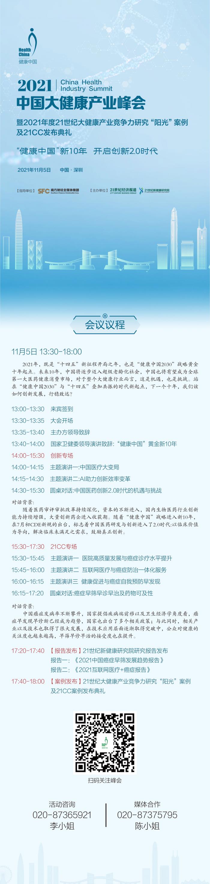 11月5日,由南方财经全媒体集团指导,《21世纪经济报道》、21世纪新健康研究院主办的2021年(第五届)中国大健康产业峰会将在深圳君悦酒店举行。