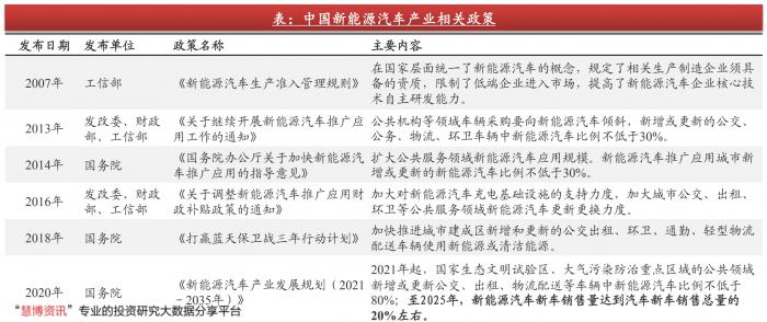 中国国务院规划至2025年,新能源汽车新车销售量达到汽车新车销售总量的20%左右。