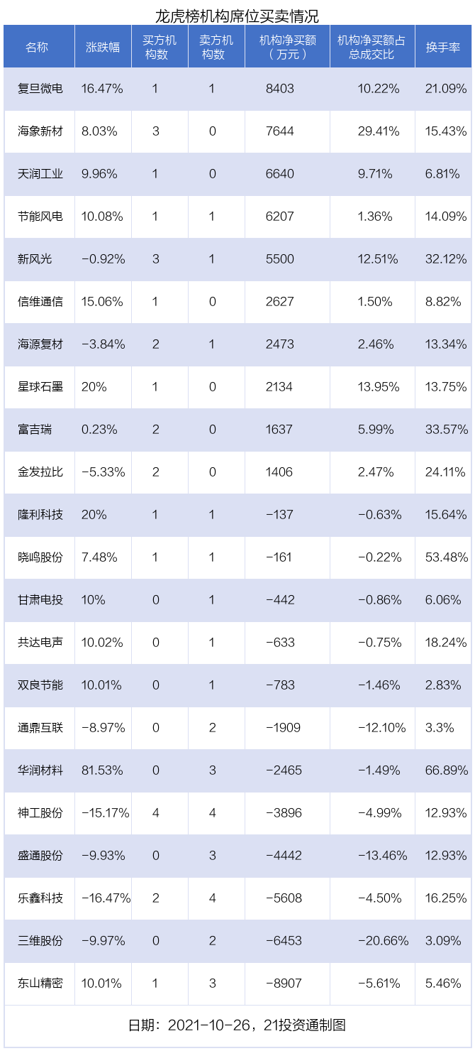 其中,机构净买入金额最多的是复旦微电(688385.SH),当日收盘上涨16.47%,换手率为21.09%。前五大买卖营业部中有2家机构,为合计净买入8403万元,占总成交金额的10.22%。