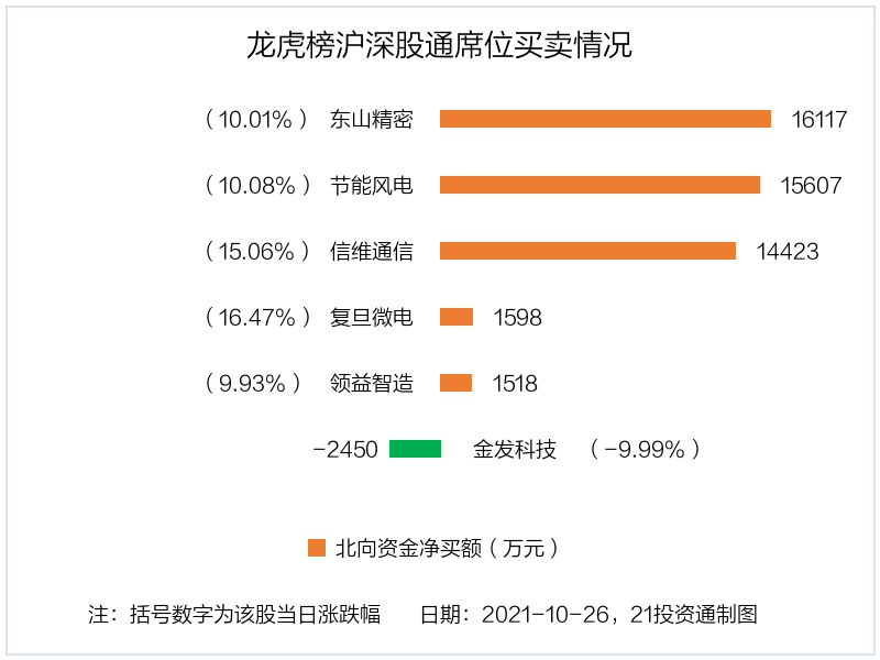 10月26日,北向资金参与龙虎榜中的个股共有6只,合计净买入4.68亿元。其中沪股通净买入2 股,净卖出1 股,合计净买入1.48亿元;深股通净买入3 股,合计净买入3.21亿元。