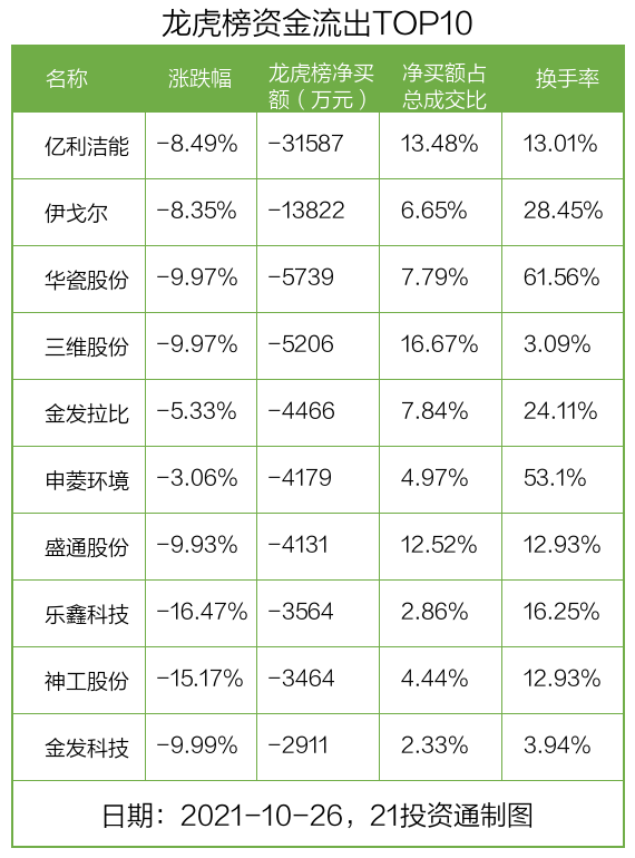 而龙虎榜中资金净流出最多的是亿利洁能(600277.SH),被净卖出为3.16亿元,占总成交金额的13.48%。亿利洁能收盘下跌8.49%,换手率为13.01%。