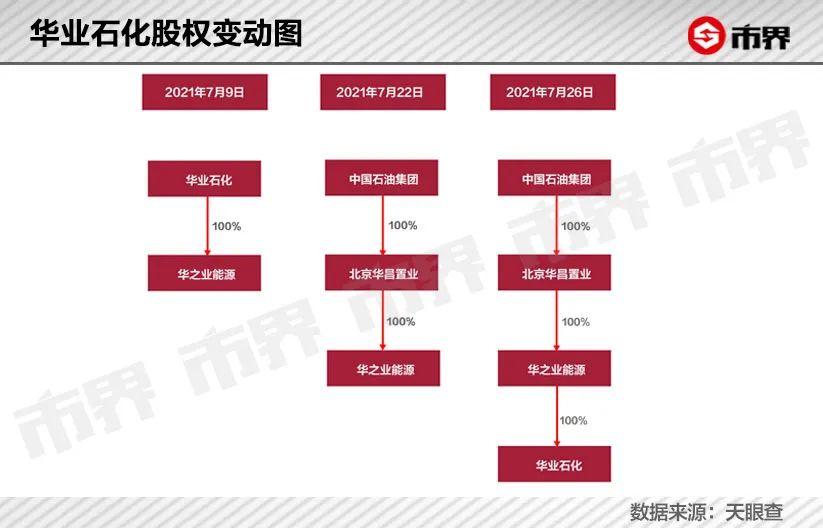 工商信息显示,华业石化于7月9日投资设立江苏华之业能源发展有限公司(以下简称“华之业能源”)。7月22日,华之业能源全资股东变更为中国石油集团全资控股的北京华昌置业有限公司。7月26日,华业石化进行工商信息变更,成为华之业能源的全资子公司。