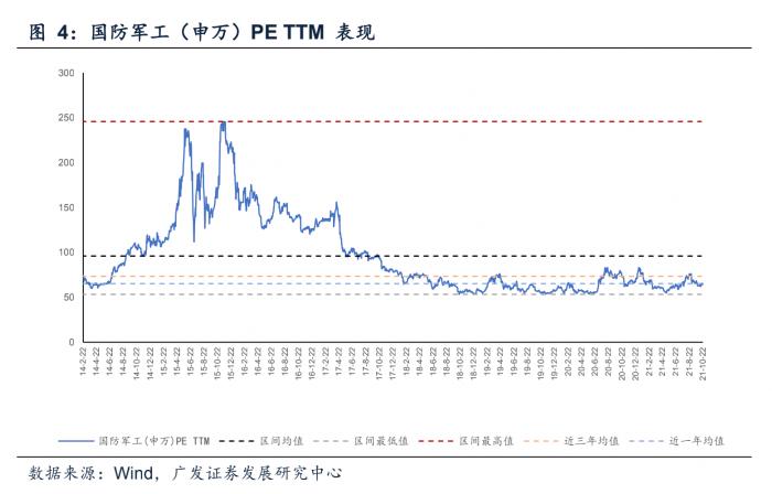从PE估值面来看,当前国防军工板块PE估值低于近三年来均值。