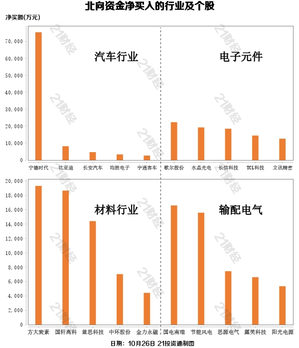 据21投资通(微信号ID:touzit21)智能监测,10月26日,北向资金净买入8.45亿元,其中沪股通净卖出14.43亿元,深股通净买入22.88亿元。