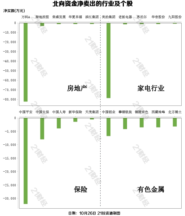 北向资金净卖出万科A(000002.SZ)、美的集团(000333.SZ)、中国平安(601318.SH)、贵州茅台(600519.SH)、通威股份(600438.SH)居前,其中,万科A被净卖出8.22亿元,美的集团被净卖出7.85亿元,中国平安被净卖出3.21亿元,贵州茅台被净卖出3.10亿元,通威股份被净卖出2.38亿元。