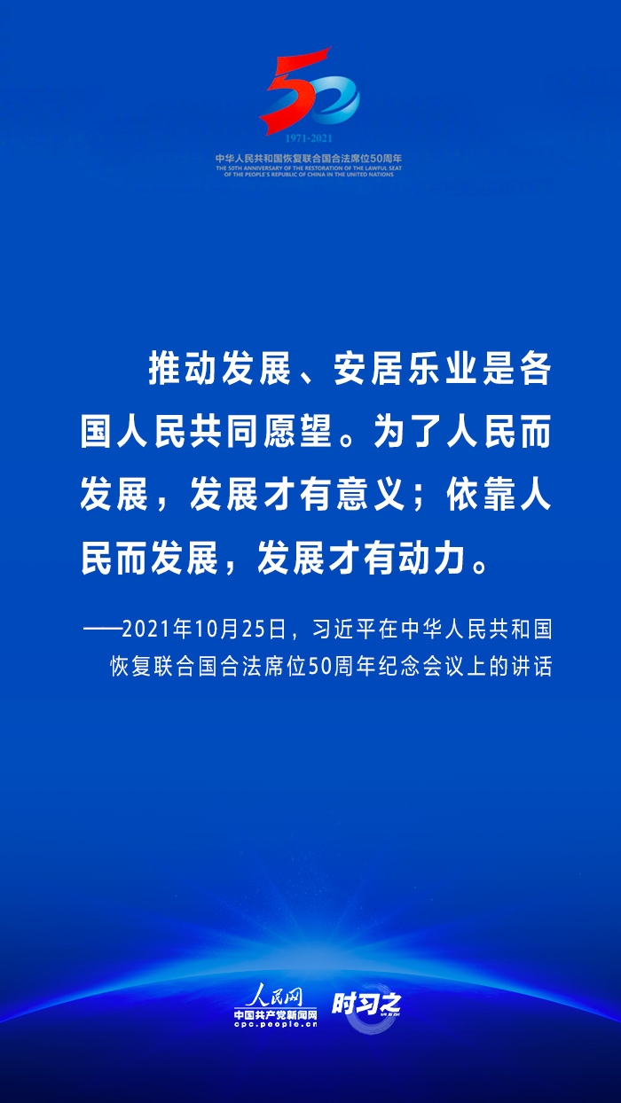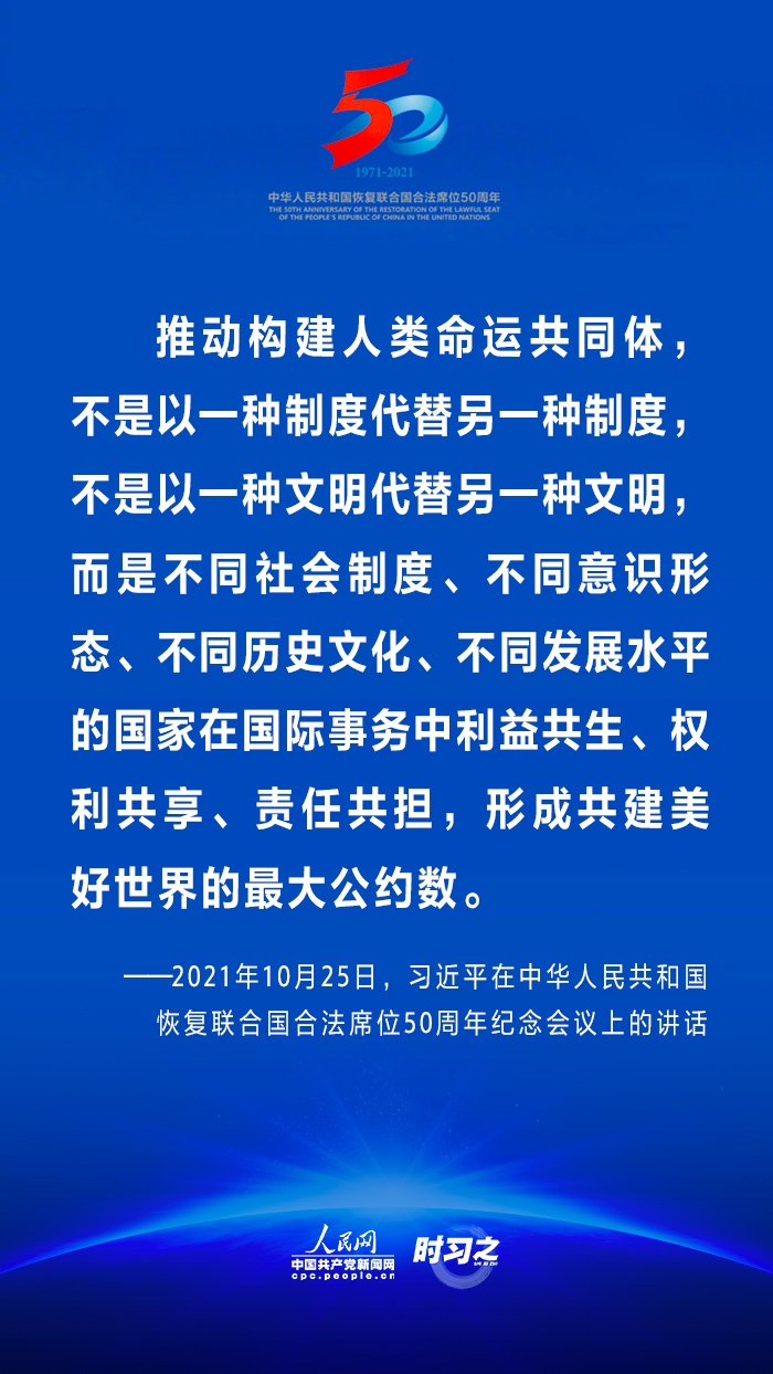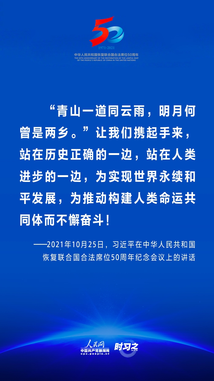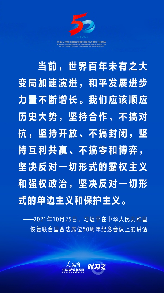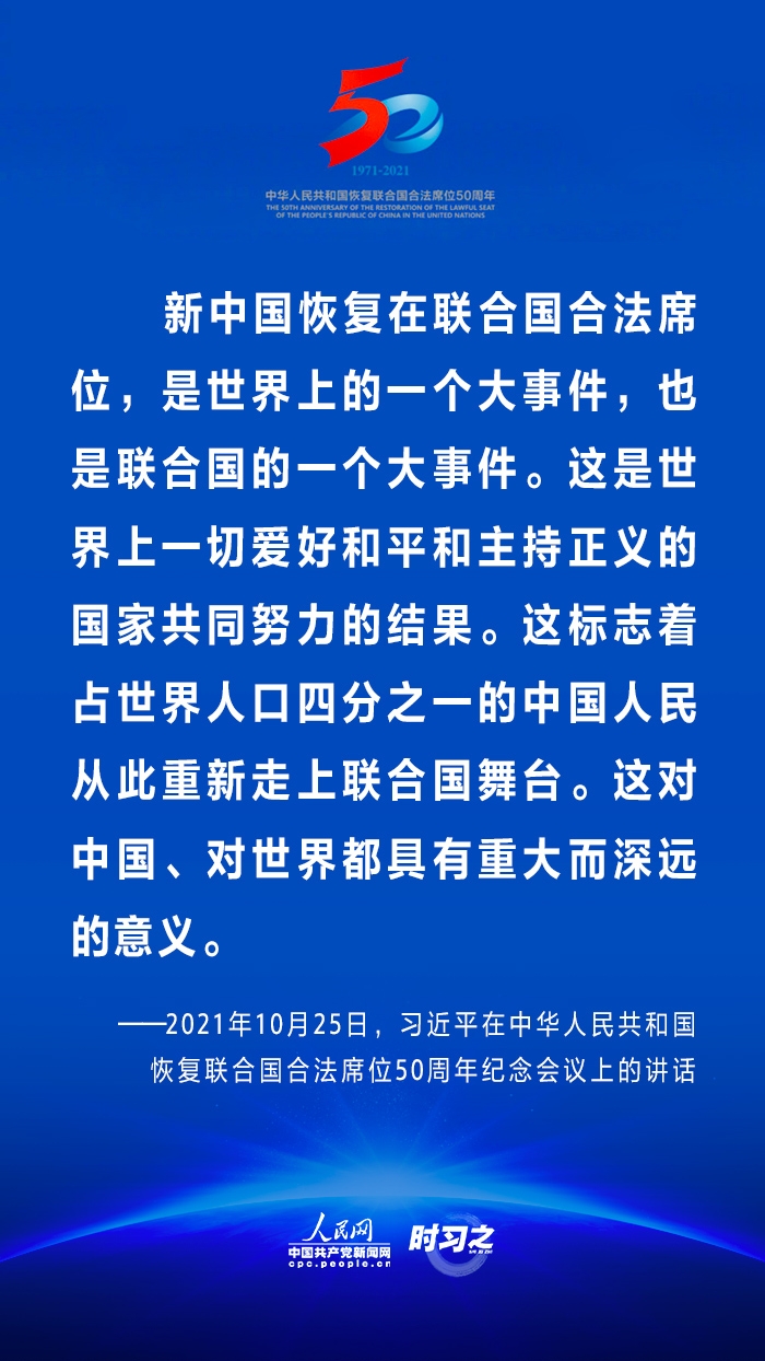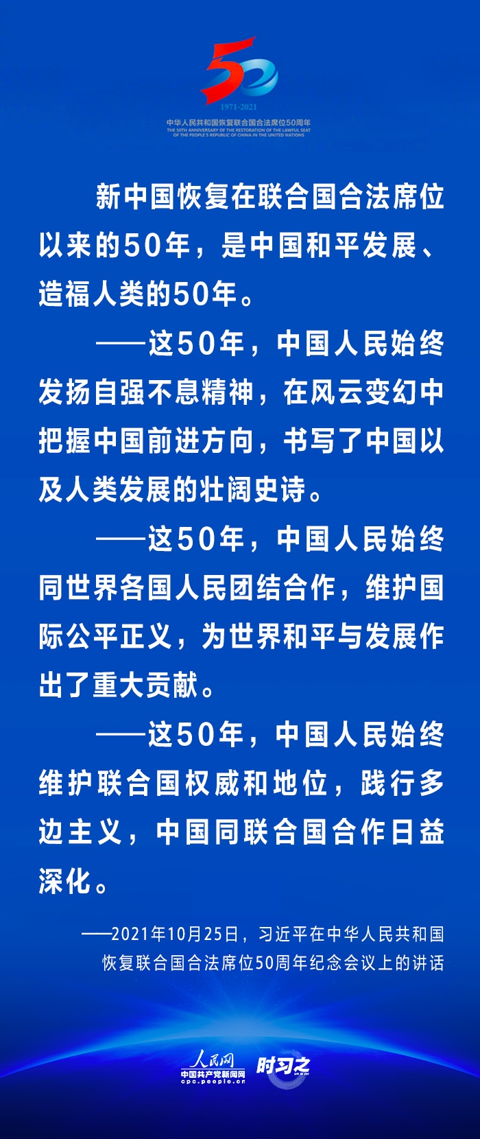 10月25日,国家主席习近平在北京出席中华人民共和国恢复联合国合法席位50周年纪念会议并发表重要讲话。在讲话中,习近平回顾了中华人民共和国恢复在联合国合法席位50年以来的重大成就,面对百年未有之大变局,重申中国将始终做世界和平的建设者、全球发展的贡献者和国际秩序的维护者。