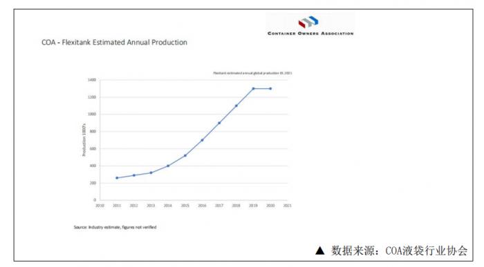 集装箱液袋行业的权威机构COA协会的统计数据显示,2019 年全球液袋产量到达顶峰,为 130 万条,按照市场价格测算,市场规模约为17亿元折合 2.6 亿美元。2019 年后,集装箱液袋行业市场增长已出现拐点,2020 年市场规模与 2019 年持平,市场需求趋于饱和,行业竞争进入激烈阶段。