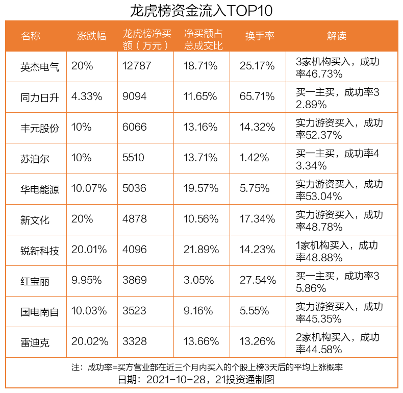 10月28日,上证指数下跌1.23%,深证成指下跌1.03%,创业板指下跌0.92%。盘后龙虎榜数据显示,共有52只个股因当日异动登上龙虎榜,资金净流入最多的是英杰电气(300820.SZ),达1.28亿元。