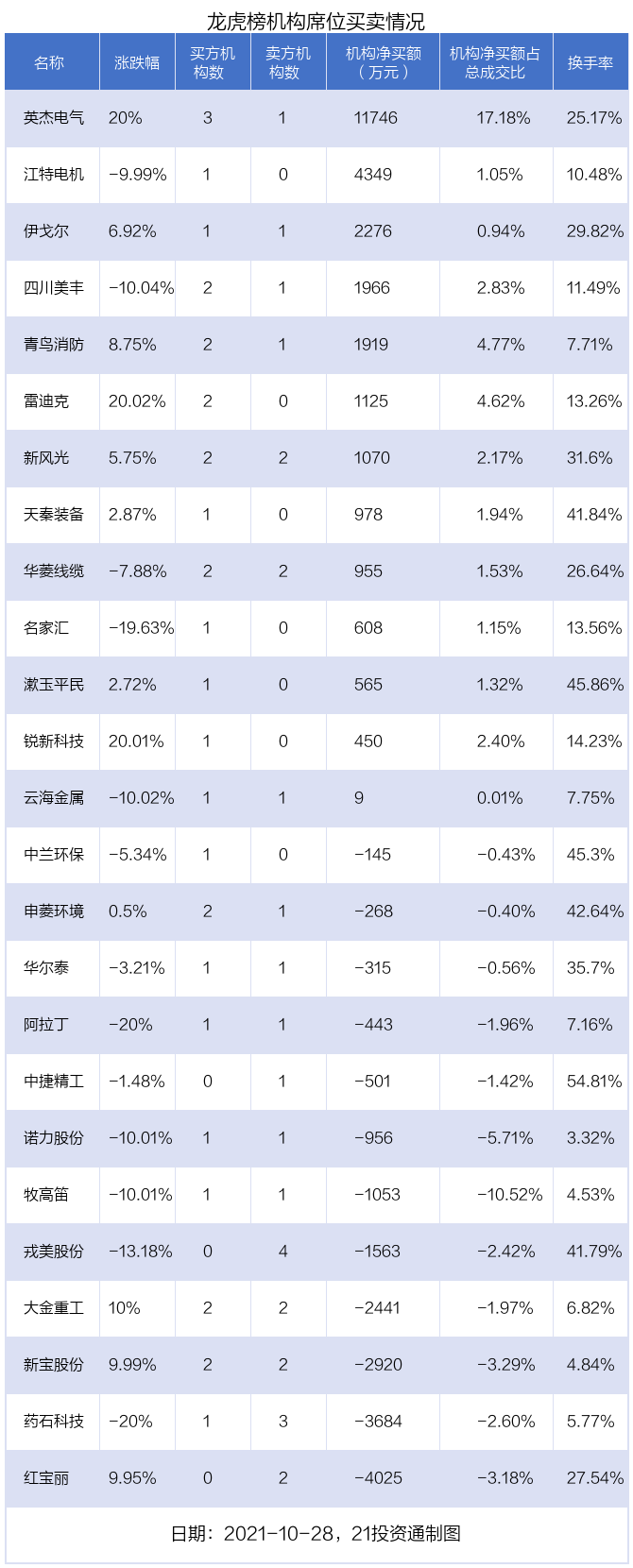 其中,机构净买入金额最多的是英杰电气(300820.SZ),当日收盘上涨20%,换手率为25.17%。前五大买卖营业部中有4家机构,为合计净买入1.17万元,占总成交金额的17.18%。