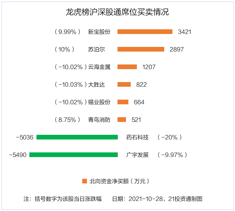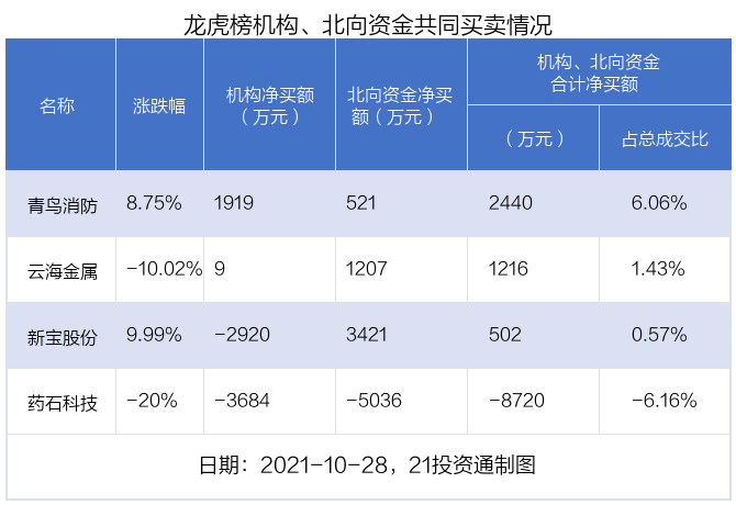 值得注意的是,机构和北向资金共同净买入了云海金属、青鸟消防等2股;共同净卖出了药石科技;在新宝股份上出现分歧,机构净卖出新宝股份2919.58万元,北向资金净买入3421.45万元。