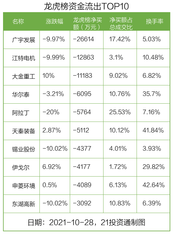而龙虎榜中资金净流出最多的是广宇发展(000537.SZ),被净卖出为2.66亿元,占总成交金额的17.42%。广宇发展收盘下跌9.97%,换手率为5.03%。
