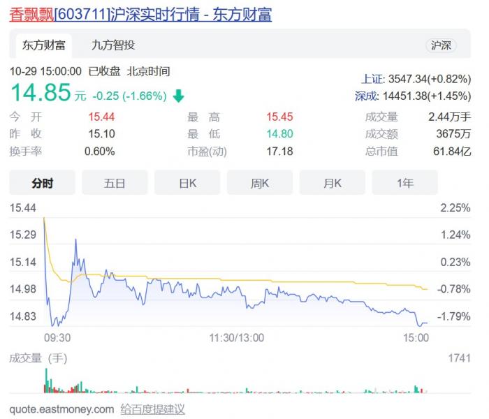 业内人士认为,在稳住基本盘的前提下,随着香飘飘即饮业务的培育成熟、加上互联网化战略的进一步落地赋能,企业的战略转型成效将有序释放。截至10月29日收盘,香飘飘报14.85元/股,较前一交易日下跌1.66%,公司总市值为61.84亿元。