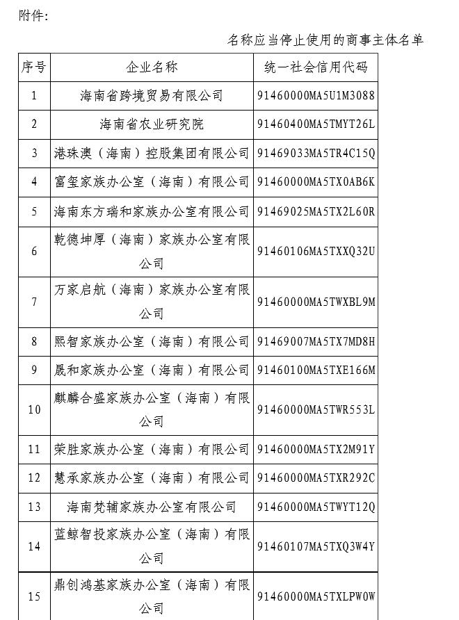 21世纪经济报道 记者辛继召 深圳报道 海南省市场监督管理局近期公告,301家名称中含“家族办公室”字样商事主体,名称应当停止使用。