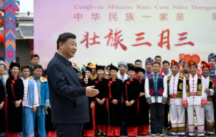 2021年4月27日,习近平总书记在南宁市广西民族博物馆外,同参加三月三“歌圩节”民族文化活动的各族群众亲切交流。