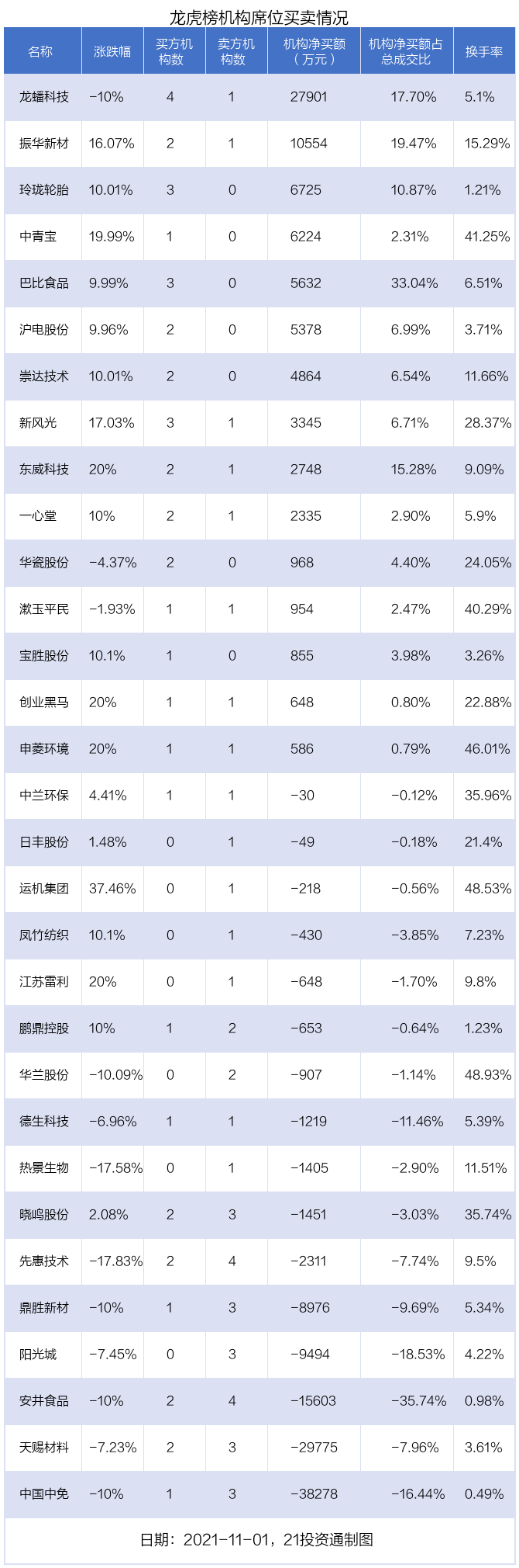 其中,机构净买入金额最多的是龙蟠科技(603906.SH),当日收盘下跌10%,换手率为5.1%。前五大买卖营业部中有5家机构,为合计净买入27901万元,占总成交金额的17.70%。