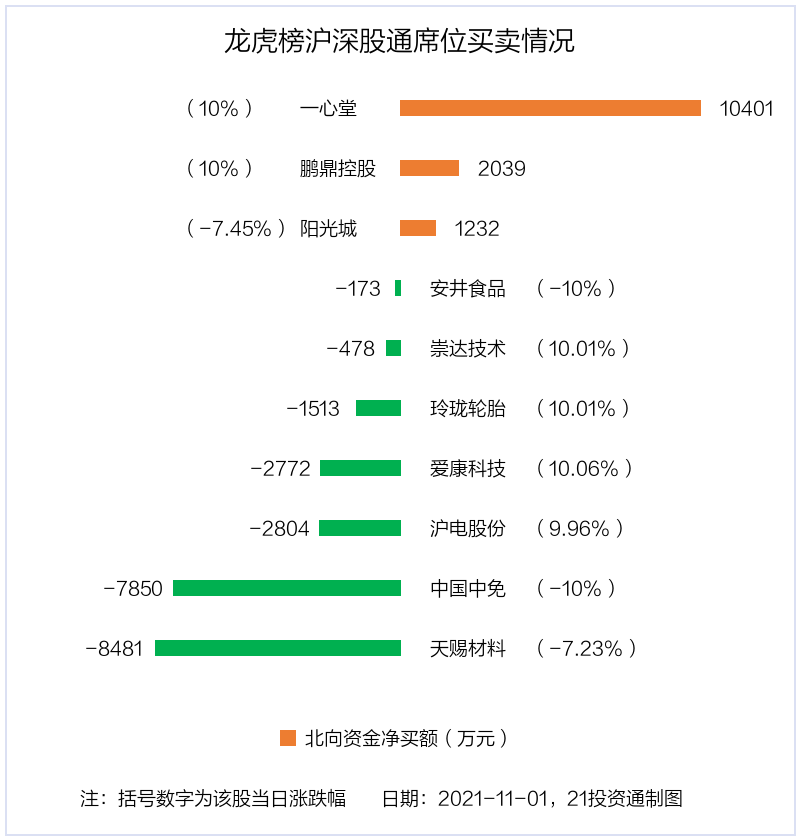 11月01日,北向资金参与龙虎榜中的个股共有10只,合计净卖出1.04亿元。其中沪股通净卖出3 股,合计净卖出9535.53万元;深股通净买入3 股,净卖出4 股,合计净卖出863.94万元。