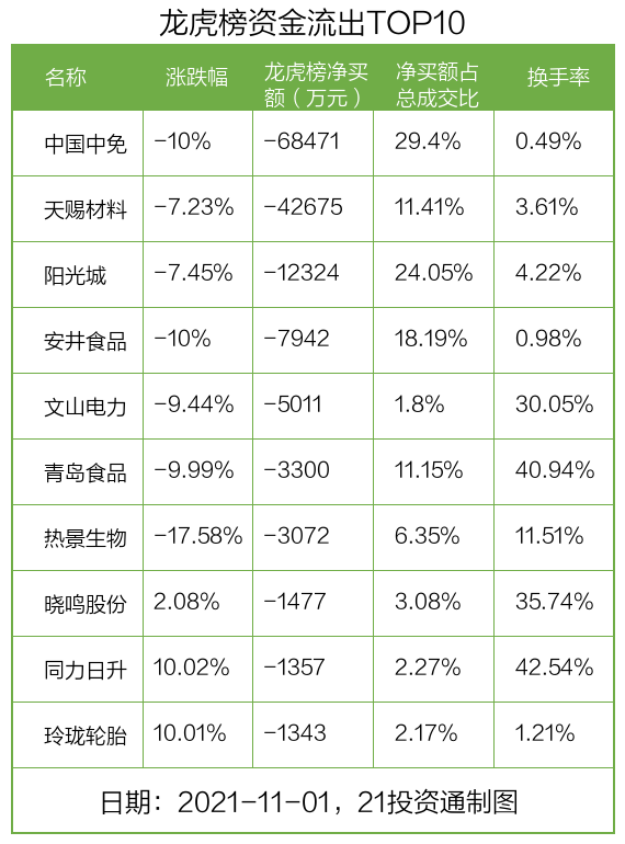 而龙虎榜中资金净流出最多的是中国中免(601888.SH),被净卖出为6.85亿元,占总成交金额的29.4%。中国中免收盘下跌10%,换手率为0.49%。