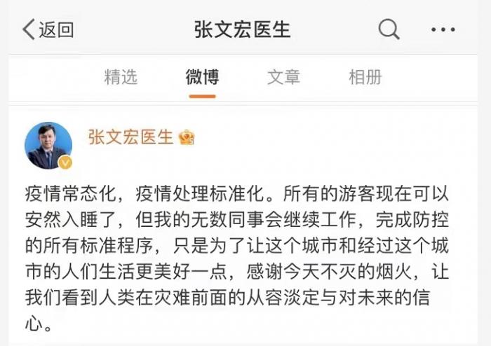 张文宏表示:疫情常态化,疫情处理标准化。所有的游客现在可以安然入睡了,但我的无数同事会继续工作,完成防控的所有标准程序,只是为了让这个城市和经过这个城市的人们生活更美好一点,感谢今天不灭的烟火,让我们看到人类在灾难前面的从容淡定与对未来的信心。